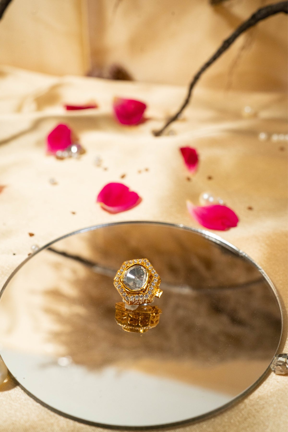 Quickshop With its radiant teardrop Polki at the center, gently embraced by a...